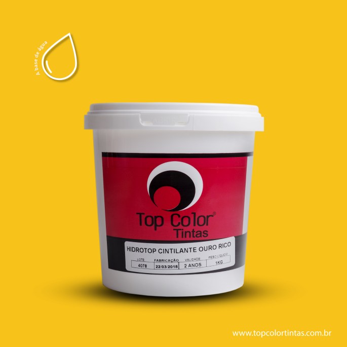 Conheça nossa Hidrotop Cintilante Ouro Rico, tinta desenvolvida para obter aspecto metálico, com alto brilho contínuo, possui cobertura média em tecidos escuro e pode ser aplicada em tecidos claros e escuros compostos por algodão, mistos ou sintéticos.